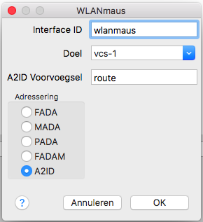 | A2ID | Het WLANmaus wissel adres wordt gebruikt als een Rocrail wissel object ID, bereik: "0001"…"2048". Als er geen wissel gevonden is met deze ID, dan worden de rijwegen, signalen, uitgangen, wissels, draaischijven en FiddleYard's doorzocht voor deze ID of Nummer. Deze manier is centrale onafhankelijk. |