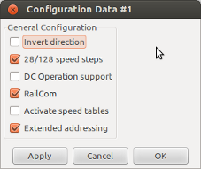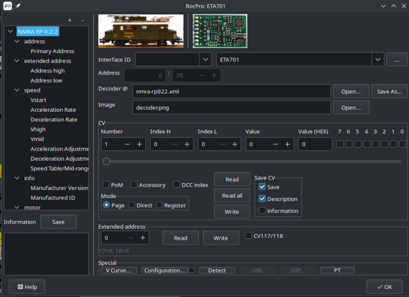 <decoder manu="NMRA" type="RP-9.2.2" web="http://nmra.org/standards/DCC/standards_rps/rp922.html" collapse="false" info="The standard of DCC mobile decoders."> <cvbyte nr="1" cat="address" desc="Primary Address" info="Base short address in range of 1-127."/> ... <cvbyte nr="29" cat="general" desc="Configuration Data #1" info="Configuration for addressing, speed steps, RailCom and DC operation."/> </decoder>
