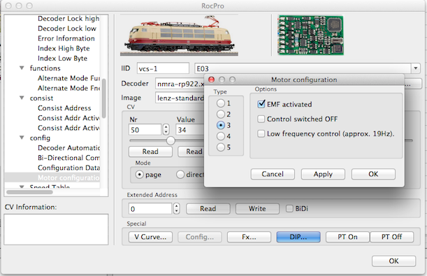 <cvbyte nr="50" cat="config" desc="Motor configuration" > <adip id="cv50"> <dipgroup caption="Type" type="0" ori="1" mask="7"> <dipvalue name="1" value="0"/> <dipvalue name="2" value="1"/> <dipvalue name="3" value="2"/> <dipvalue name="4" value="3"/> <dipvalue name="5" value="4"/> </dipgroup> <dipgroup caption="Options" type="1" ori="1" spacing="4"> <dipvalue name="EMF activated" value="32"/> <dipvalue name="Control switched OFF" value="64"/> <dipvalue name="Low frequency control (approx. 19Hz)." value="128"/> </dipgroup> </adip> </cvbyte> <cvbyte nr="51" cat="config" desc="Motor configuration" dipid="cv50"/>