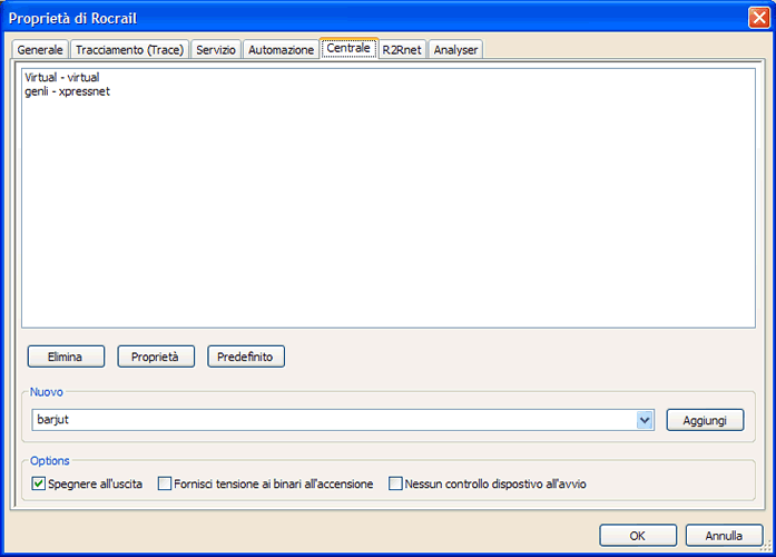 Scheda di dialogo per impostare le Centrali Digitali connesse. Si apre dal menù File: "Proprietà di Rocrail ...".