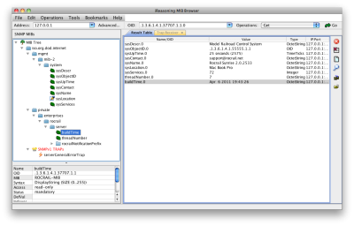 $ snmpget -v2c -c public localhost SNMPv2-MIB::sysDescr.0 SNMPv2-MIB::sysDescr.0 = STRING: Rocrail 2.0.2508 Sunrise $ snmpget -v2c -c public localhost SNMPv2-MIB::sysUpTime.0 SNMPv2-MIB::sysUpTime.0 = Timeticks: (3443) 0:00:34.43
