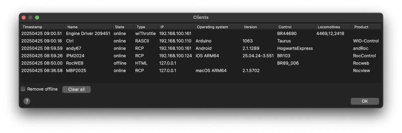 The Client log listed up all connections and shows which locomotives are currently controlled.