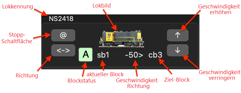 Die Felder "Block", "Geschwindigkeit", "Modus" und "Ziel" haben den gleichen Inhalt wie in der Lok-Tabelle.