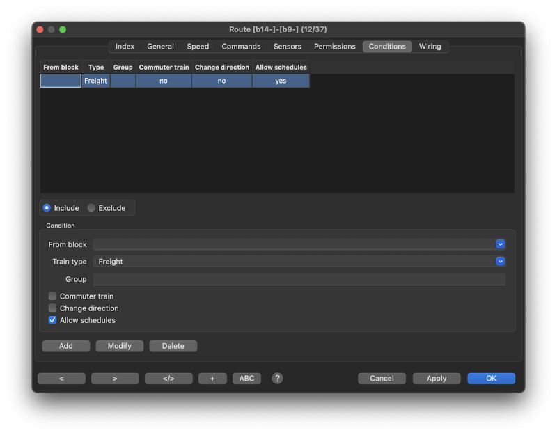 Route conditions can be used to include or exclude trains, depending on where it came from and other attributes.