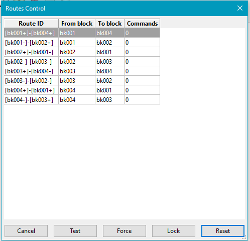 Si seleziona l'instradamento da verificare e si preme il tasto Test. Rocrail invierà i comandi ai vari deviatoi interessati, così che potremo verificare il corretto crearsi dell'instradamento.