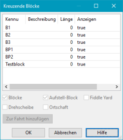 Wenn die Fahrstraße einen oder mehrere weitere Blöcke kreuzt (über andere Blöcke führt), dann sollten diese hier benannt werden. Dadurch ist Rocrail in der Lage Kollisionen zu vermeiden, indem diese Blöcke beim Befahren der Fahrstraße auch reserviert werden.