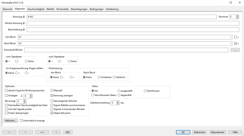 - Übersicht | Allgemein | Geschwindigkeit | Befehle | Rückmelder | Berechtigungen | Bedingungen | Verkabelung | Gleise | Menü
