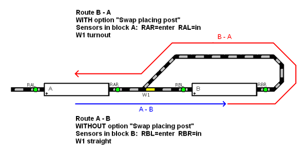 Esempio:3) in caso di un anello di ritorno con un blocco "A" prima (rispettivamente dietro) dell'anello e un blocco "B" nell'anello, l'itinerario di ingresso nell'anello, da "A" a "B", é impostato senza il parametro di posizionamento e l'itinerario di uscita dall'anello, da "B" ad "A", é impostato con il parametro "Invertire orientamento in seguito".