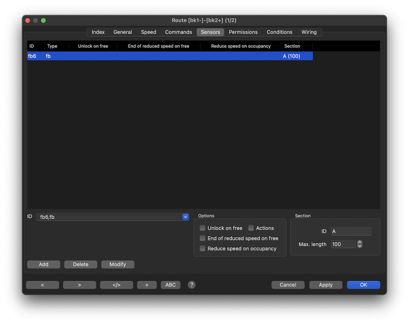If a sensor or output has been got obsolete for this route it can be selected from the list and deleted with the Delete button.
