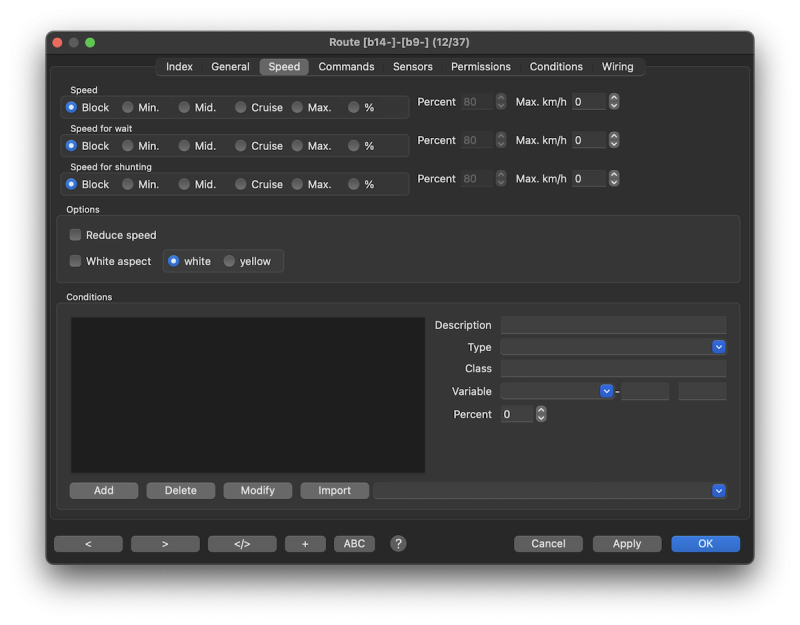 - Index | General | Speed | Commands | Sensors | Permissions | Conditions | Wiring | Tracks | Generate via