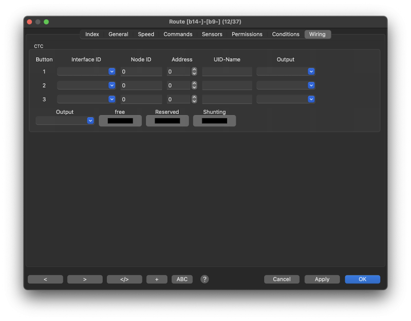 - Index | General | Speed | Commands | Sensors | Permissions | Conditions | Wiring | Tracks | Generate via