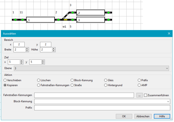 Durch die Auswahl einer anderen Ebene kann auch auf eine andere Gleisplan-Registerkarte verschoben oder dort hin kopiert werden.