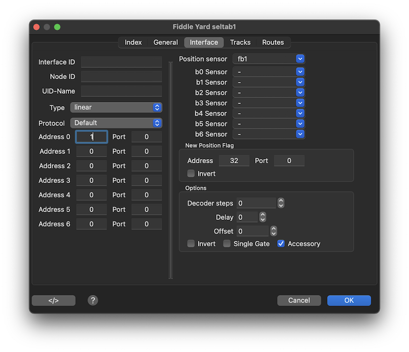 Als er meer dan één centrale wordt gebruikt, wordt in dit veld de centrale vermeld die verantwoordelijk is voor de aansturing van de decoder. Het veld "Interface ID" kan leeg blijven als het object is verbonden met de eerste centrale (eerste 'digint' in rocrail.ini) uit de lijst met centrales.