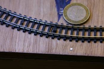 ![]() | Rail Märklin C avec 74030 et 74995. Le pont entre les rails extérieurs peut être facilement coupé sans trop de dommages. Il faut s'assurer qu'il n' y a pas de joint entre les rails. |