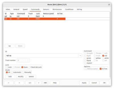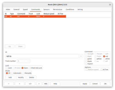 - Le signal n'est pas automatiquement réinitialisé au "rouge", pour cela une entrée en plus doit être faite dans l'itinéraire avec le rouge "Une fois libéré".