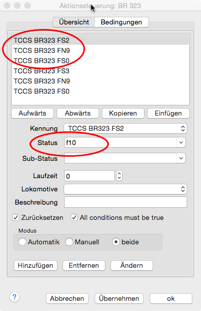 Diese drei angelegten Aktionen werden jetzt in den Lok-Eigenschaften einer Aktionssteuerung