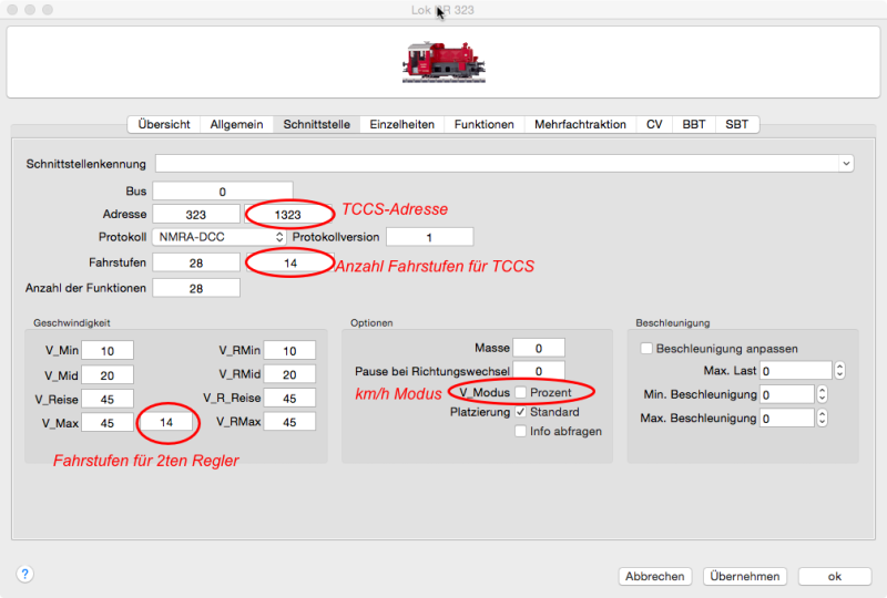 Für die Einrichtung einer Lok mit TCCS sind nun folgende Einstellungen notwendig: