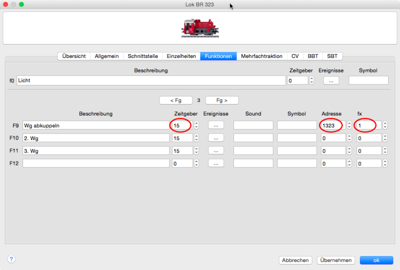 Dazu wählt man eine freie Funktionstaste in Rocrail aus (in diesem Beispiel F9). Unter Adresse