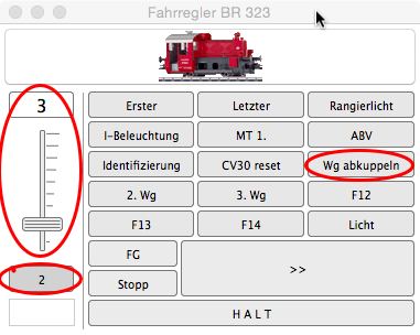 Man wechselt auf den Fahrregler 2 und stellt den Geschwindigkeitsregler auf Stufe 3. Dann wird die Taste F9 (Wg abkuppeln) betätigt.