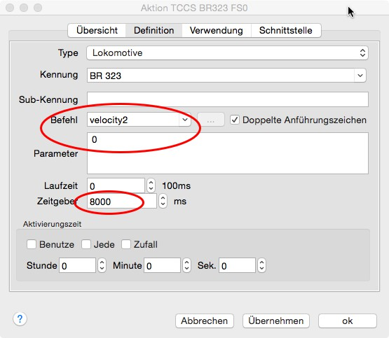 | Zeitgeber: | 3000 (Verzögert die Ausführung der Aktion um 3 Sek.. Dieser Wert hat sich in der Praxis bewährt, damit erst der Fahrregler auf 2 eingestellt wird und danach die Funktion abkuppeln ausgelöst wird) |