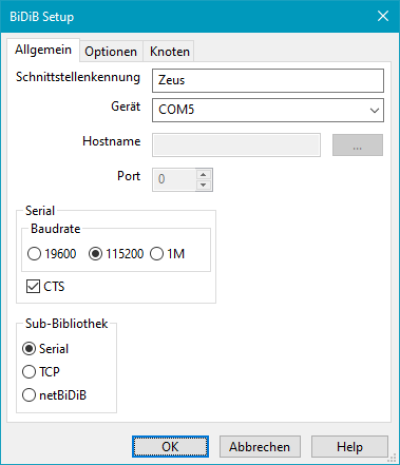Der Zeus kann mit folgenden Einstellungen als BiDiB-Controller hinzugefügt werden: