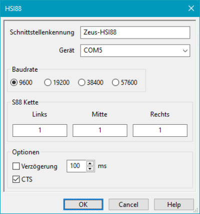 Die Tabelle zeigt die unterschiedliche Zuordnung der S88-Ketten von HSI88 (LDT) und ZEUS (Tams) zu den Einstellungen im Dialog.