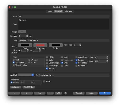 | Example for an action to speak the updated text could look like this. | In the 'properties' of the text-element this action needs to be linked to this text object using the actioncontrol dialog like this. |