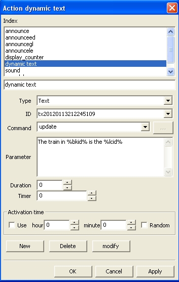 Dans l'exemple ci-dessus, il s'agirait du bloc pour lequel le texte dynamique sera mis à jour avec l'ID de la locomotive. Par conséquent, si le bloc qui est associé à l'action est le bloc LP1 et que le prochain train à entrer dans le bloc est 3MT, l'objet de texte serait "Le train en LP1 est le 3MT".