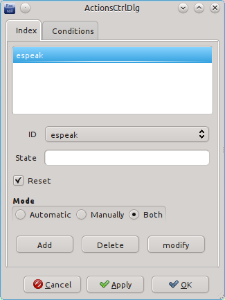| Exemple d'une action pour parler le texte mis à jour pourrait ressembler à ceci. | Dans les'propriétés'de l'élément texte, cette action doit être liée à cet objet de texte en utilisant la boîte de contrôle d'action dialogue comme ceci. |