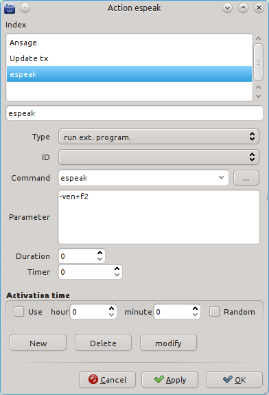 Une action peut être utilisée pour laisser le texte parlé par un programme comme espeak sur le serveur.