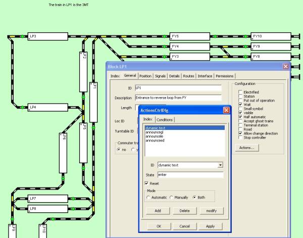 Suivant l'exemple, les Propriétés du bloc LP1 sont choisies. Dans le sous-menu Actions, l'action qui modifie le texte dynamique est sélectionnée dans la liste du champ ID. La zone Etat doit être lue en entrée de façon à ce que l'action soit déclenchée lorsqu'un train entre dans le bloc.