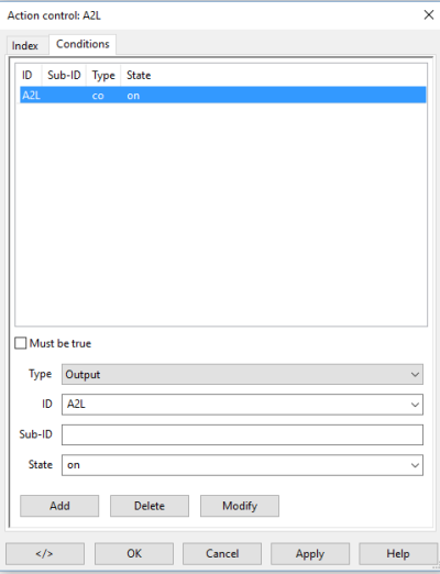 Thus, the output works as a "switch" with a timer. It allows time for the second button of the route to be used, all outputs are configured as a switch and have an output-related action “RESETxxx”, which sets the currently active output, back to inactive after 4 seconds. xxx is the name of the corresponding output.