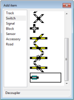 In edit mode elements of the track diagram can be added or changed with a right click or by Drag&Drop using the Add item dialog.