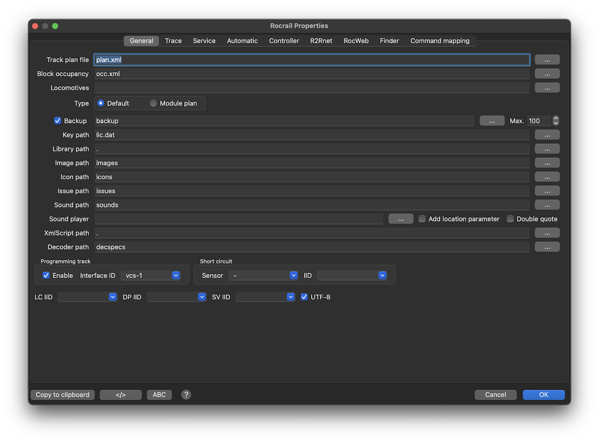 You have to click on OK to complete the operation. Now the server has to be told to use the new .xml file at the next start. Click on "File/Rocrail properties. The name of the new .xml file has to type in in the tab "General".