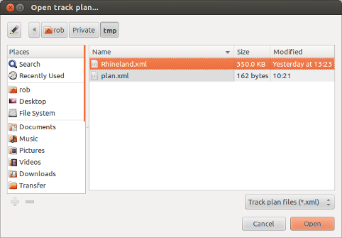 This Function is mostly used if Rocrail Server and Gui are running on different PC's. Alternatively the track diagram can be copied in the Rocrail work directory with the copy function of the used operating system. To upload a track diagram to the server the rocrail daemon has to be started. After that you have to click on "Upload" in the File Menu of Rocgui. The Dialog "Open track Diagram" appears.