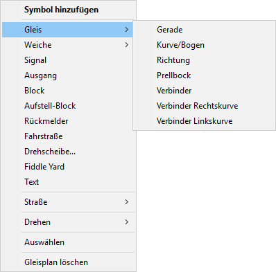 Wenn der Gleisplan zum Bearbeiten freigeschaltet wurde, bietet Rocrail über das Kontextmenu die folgenden Gleistypen an: