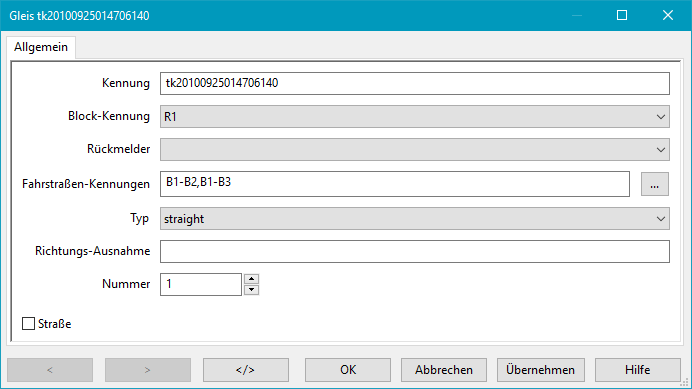 Einzelheiten zu den Registerkarten des Gleis-Dialogs sind beim Gleis-Objekt beschrieben.