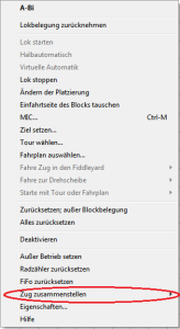 - Züge können im Lokbedienfeld per rechtem Mausklick → "Zug zuordnen" oder "Zug lösen" an eine Lokomotive an- oder von dieser abgehängt werden.