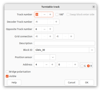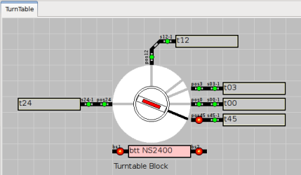 The setup as an external Bridge block is necessary if, for example, the display of the block status colors, the locomotive/train identifiers or a more flexible assignment of sensors and events is desired than described here: Turntable : Interface.