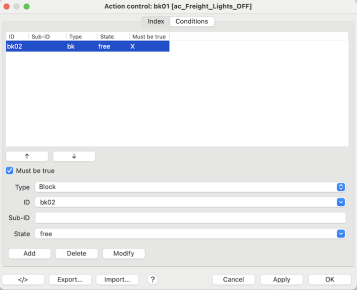 Zwei Aktionen sind definiert, um den Ausgang „co_Freight_Lights“ ein- oder auszuschalten.