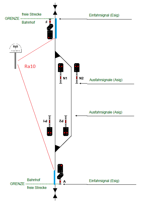 | Anhand der Skizze lässt sich das Zusammenspiel von Einfahrsignal und Ausfahrsignal gut betrachten. Die beiden Einfahrsignale (Esig) sind die Grenzen des Bahnhofes. Der Entfernung zum Bahnhof ist so gewählt, dass im Bahnhof über die Weichen hinaus bis zur Rangierhalttafel (Ra10) rangiert werden kann, ohne dass sich die Rangiereinheit im Gefahrenbereich / Durchrutschweg (hellbaue Linie) befindet. Der Durchrutschweg ist der Weg, den ein Zug bei unzulässiger Vorbeifahrt am HALT zeigenden Signal benötigt um zu halten. Wenn im Bahnhof viel rangiert wird und vor allem Lange Züge verschoben werden müssen, kann so eine Ra10 Tafel schonmal einige hundert Meter hinter den Ausfahrsignalen stehen. Für den Fall einer Störung des Einfahrsignals sind Ersatzsignale an den Signalen installiert. Siehe auch Kapitel Ersatzsignal / Zusatzsignale | | |