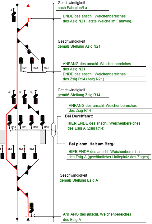 Nach der letzen Weiche im Fahrweg kann auf die im Fahrplan angegebene Geschwindigkeit gefahren werden.