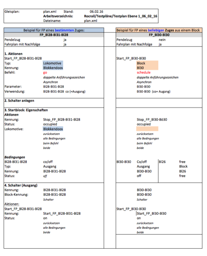 Die beiden FP unterscheiden sich im wesentlichen dadurch, dass im ersten Beispiel der Start einer bestimmten Lok mit dem Aktionsbefehl "go" versehen werden muss, während für den Start einer beliebigen Lok (2. Beispiel) der Aktionsbefehl "schedule" vorgesehen ist!