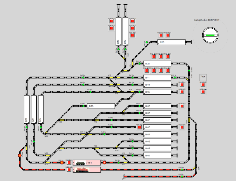 • Gegenüberstellung der beiden Touren im Bl24 und im Bl12 1. Anlegen einer Aktion für den Start_Bl24-Bl24 Der Ausgang wird später angelegt und ist zunächst nicht einzutragen 2. Anlegen eines Schalters (Wechsel im Gleisplan “Plan bearbeiten”) Eigenschaften werden später eingetragen 3. Innerhalb der Blockeienschaften eine Aktion aufrufen. Aktion im Bl24: mit Eintreffen des Zuges Gravita 10 startet die Lok E-164 ihre Tour Bl12-Bl12 Diese Akton steht unter der aufgeführten Bedingung, dass der Schalter (Ausgang) im Bl24 auf “on” steht! 4. Die Eigenschaften des Schalters neben dem Bl24 umfassen einmal den Start der Tour Bl24-Bl24 und die Bedingung, dass der Schalter (Ausgang) neben dem Block 12 auf “off” steht, so dass die E-164 nicht fahren kann! In gleicher Weise sind die Einträge für den Block 12 vorzunehmen, der Ausgangspunkt für die Tour der E-164 ist. Zu beachten ist, dass der Start der “Partner-Tour” (also für die E-164 eben die Gravita 10) immer dann beginnen kann, wenn die Ausgangslok in ihrem “Heimatblock” occupied meldet! Mit diesen wechselseitigen Touren werde ich auch einige der geplanten Lok-Fahrten zwischen den rd. 10 Rangiergleisen durchführen, so dass sich i.d.R. immer 2 Rangierloks abwechseln bewegen. Dies kann natürlich gleichzeitig mit 2 anderen Rangierloks auch in einem Bereich geschehen, wo sich die Rangierbereiche nicht überschneiden. Daneben habe ich Fahrpläne mit Start-Stop-Schalter vorgesehen, die nur einzelne Lokbewegungen vorsehen. Die diesbezüglichen Einstellungen werde ich anschließend ebenfalls hier darstellen! Gerne bin ich für Anregungen und/oder konstrutive Kritik dankbar! Wichtig ist mir der Hinweis, dass derartige Beispiele der user-Seiten an passenden Stellen in der Wiki verlinkt sein sollten, damit diejenigen user sich die Einarbeitung in die unglaublich facettenreiche Welt von Rocrail erleichtern.