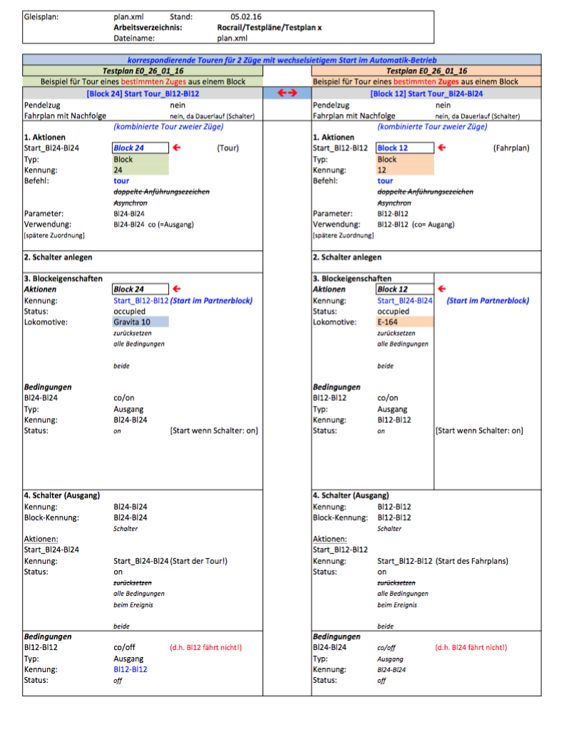 Die Gravita 10 im Block 24 (unterer Tunnel) beginnt ihre Tour mit der Betätigung des Schalter neben dem Bl24, fährt gem. Fahrplan 2 Runden und kehrt in den Bl24 (Heimatblock) zurück. Mit Erreichen dieses Ausgangsblocks (occupied) und der Wartezeit von 1 Minute startet die E-164 ihre Tour automatisch vom Block 12 aus, fährt gem. ihres Fahrplans ebenfalls 2 Runden, um sodann auch wieder in ihren Heimatblock einzukehren. Diese Abwicklung wird solange fortgesetzt, bis der Schalter wieder betätigt wird und dieser wieder von grün auf rot wechselt. Die Zusammenhänge zwischen den anzulegenden Aktionen, Anlegen eines Schalters, Eintrag von Aktionen in den Blockeigenschaften mit den notwendigen Bedingungen und die Einstellungen des angelegten Schalters (= Ausgang) ist in der nachfolgenden Übersicht dargestellt. Sie zeigt auf einfache Weise die 4 Bereiche für beide Touren (Gegenüberstellung) und macht auf die Einzelheiten aufmerksam, die einzustellen sind.