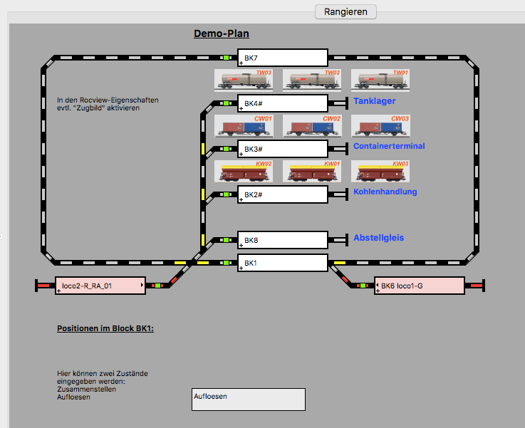 Im Demo-Beispiel sind diese Code-Schnipsel ebenfalls verwendet und bieten die Möglichkeit, Rangierabläufe visualisiert nachzuvollziehen. Die Variable charge gibt dabei das Szenario vor. Hat die Variable charge als Inhalt "loaded" werden beladene Wagons zu einem Güterzug zusammengestellt und leere Wagons in die Abstellgleise gestellt. Beim Inhalt "empty" genau umgekehrtes Prinzip. Außerdem werden leere Wagons, die vor beladenen Wagons im Abstellgleis stehen in einen anderen Block verschoben, um sie zum Schluß wieder in das entsprechende Abstellgleis zurückzustellen. Im Textfeld sind zwei Eingabemöglichkeiten gegeben.