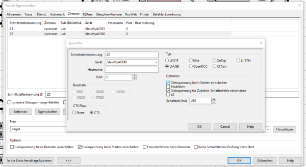 Bei meinem Beispiel sind 2 Lenz LZV100 über je 1 Interface 23151 angeschlossen, daher ist die Vergabe einer Schnittstellenkennung erforderlich. bei nur 1 Zentrale sollte auf eine Schnittstellenkennung verzichtet werden. Aus Verkabelungsgründen ist die Zentrale mit der Schnittstellenkennung "Z2" anschlusstechnisch die 1. Zentrale, sie ist daher als "/dev/ttyACM0" angeschlossen, wie im Bild dargestellt. Das wäre auch die Einstellung, wenn nur eine Zentrale angeschlossen wird.