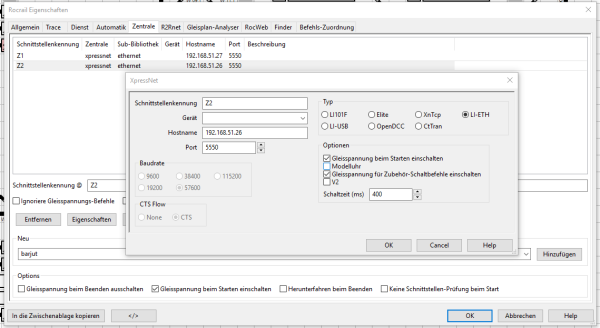 In den Rocrail-Eigenschaften, Reiter Zentrale sind nachstehende Einstellungen vorzunehmen (bitte die korrekte Zentrale / Schnittstelle) bei mehreren Zentralen auswählen !):