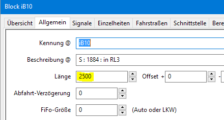 - Länge: in den Blöcken iB6,9,10 die max. Zuglänge (bei mir 2500) eintragen. Dies trifft zwar für den einzelnen Block nicht zu, aber für die Blockgruppe als Ganzes