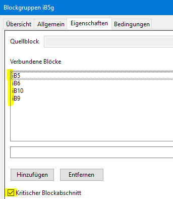 - Blockgruppe: Blöcke iB(5),6,9,10 zu einer Blockgruppe zusammenfassen und als kritischen Blockabschnitt markieren. Um ein Festfahren von Zügen zu verhindern, ist iB5 zusätzlich dieser Blockgruppe zugeordnet